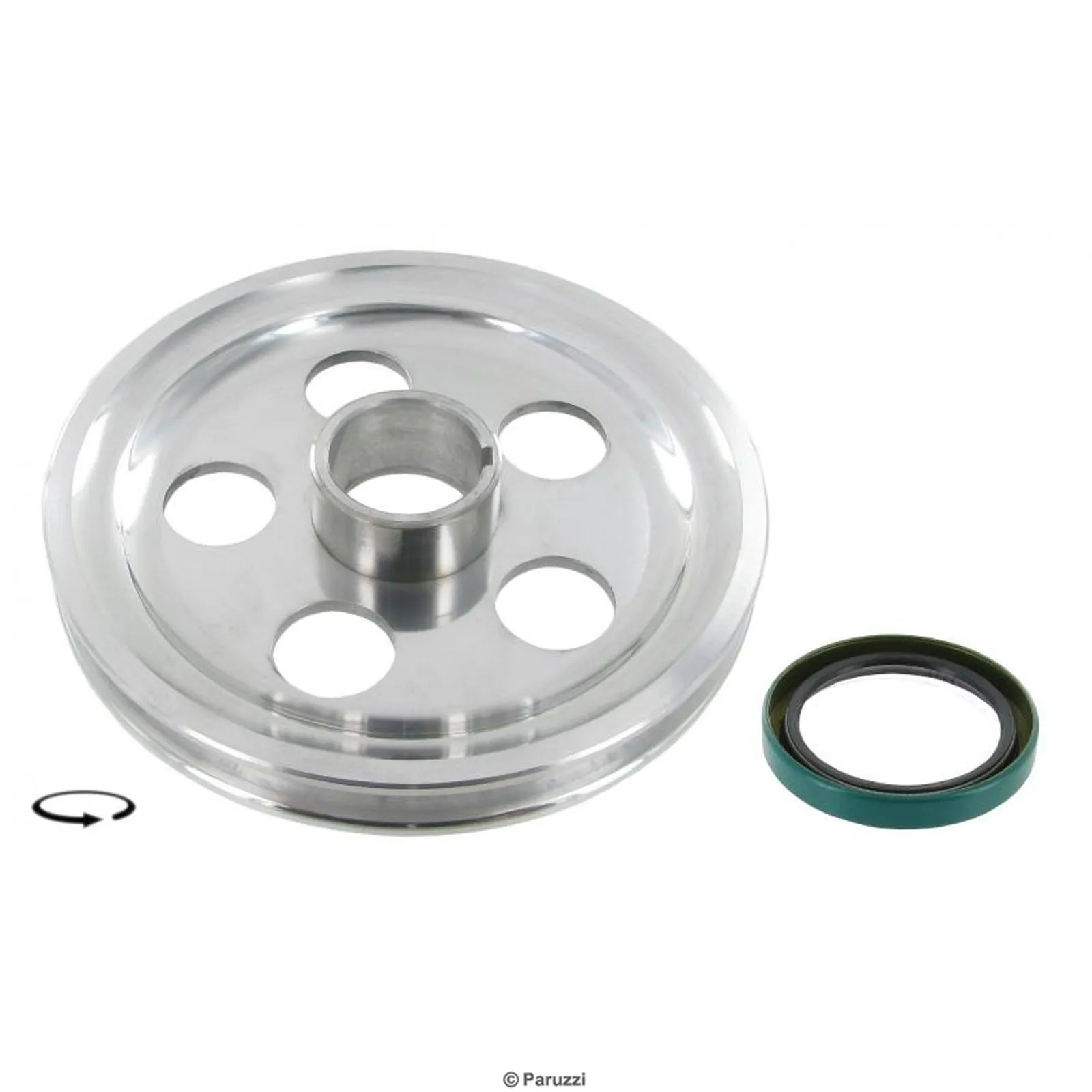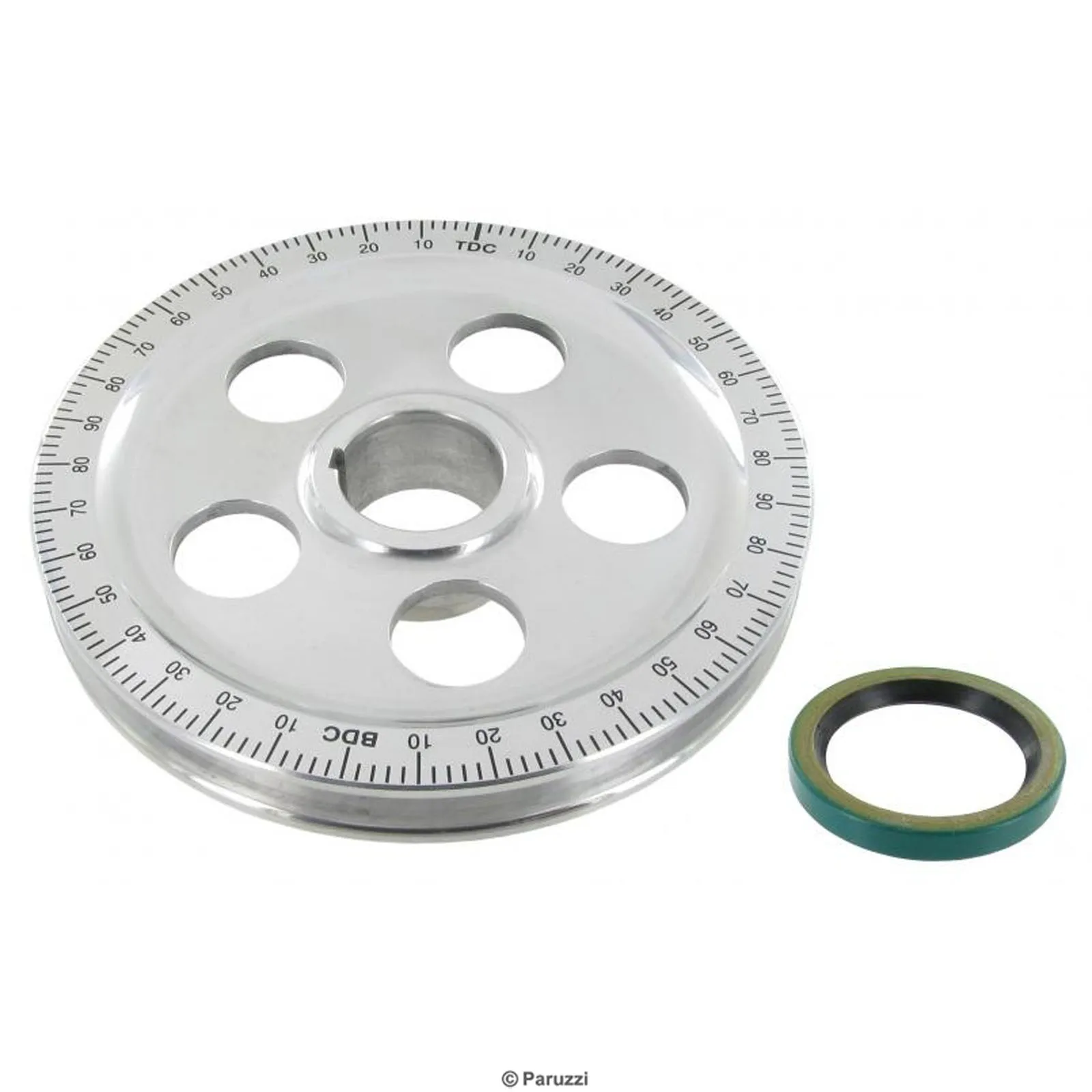 Alle Sandabdichtungsrollen sind aus poliertem Aluminium hergestellt und haben eine schwarz gravierte Skala. Die Riemenscheiben haben einen Durchmesser von 170 mm, dies ist das Original, das nur bei 1200 und 1300 ccm Motoren verwendet wird. Die 1500er- und 1600er-Motoren sind ursprünglich mit einer 177-mm-Riemenscheibe ausgestattet, der größere Durchmesser ergibt eine höhere Kühlleistung, die für die höhere Motorleistung dieser Motoren erforderlich ist. Eine Riemenscheibe mit geringerem Gewicht und kleinerem Durchmesser ist der Schlüssel zum Erreichen der maximalen Motorleistung, daher werden diese 170-mm-Riemenscheiben häufig bei Motoren mit 1500 und 1600 ccm verwendet. Es gibt jedoch einen Nachteil: Die Kühlleistung wird durch den kleineren Durchmesser reduziert, weshalb die 1500er und 1600er Motoren nicht in der Liste aufgeführt sind.