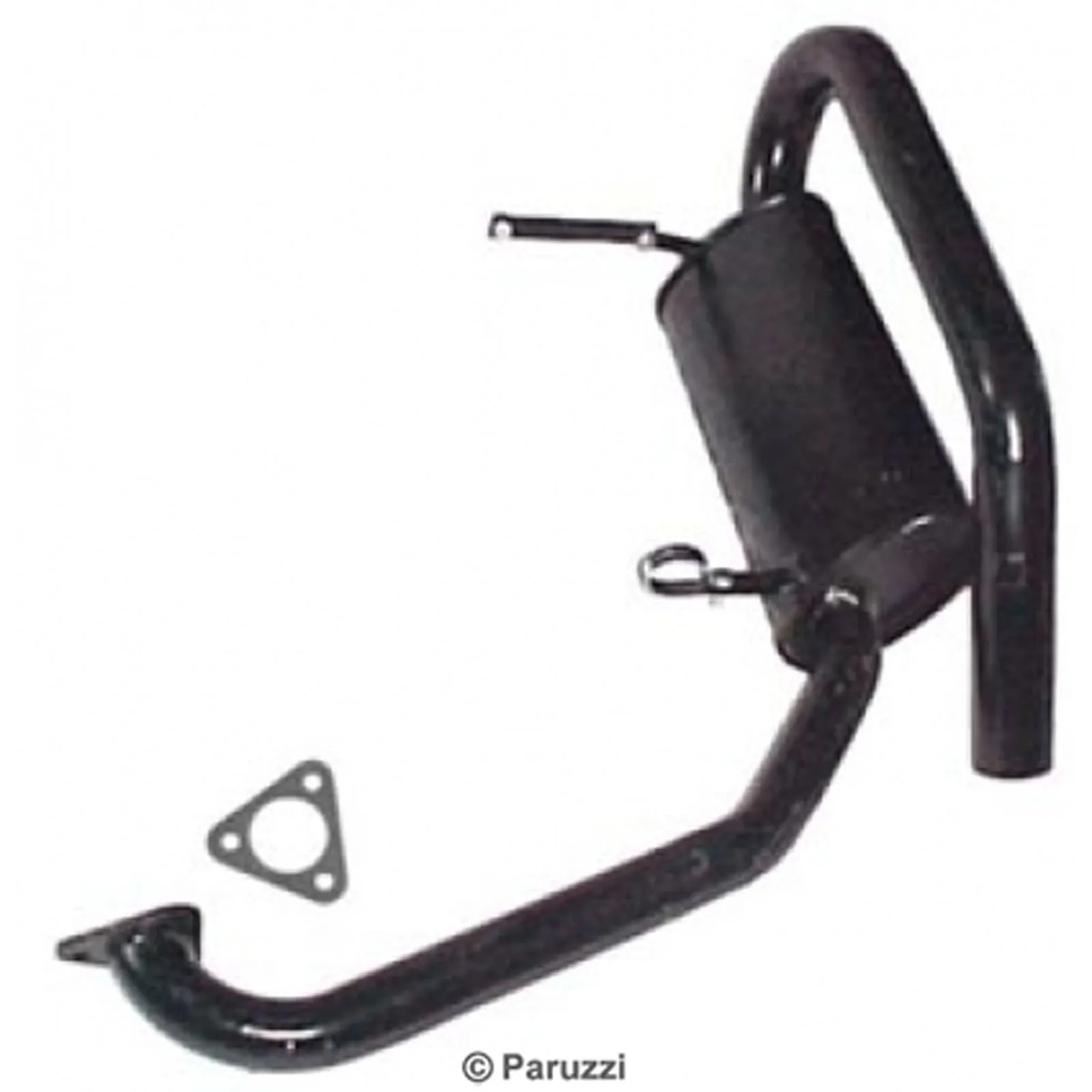Eine schöne Lösung, wenn Sie den Auspuff komplett verschwinden lassen möchten und Ihr VW auch noch sehr tiefergelegt ist. Der Schalldämpfer ist so konstruiert, dass er neben dem Motor liegt. Der gesamte Schalldämpfer ist in schwarzem Transportlack lackiert.
