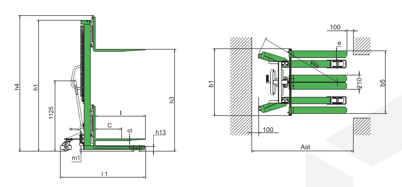 Gesamtlänge mit 800mm Gabeln: 1380 mm (Maßzeichnung l1)