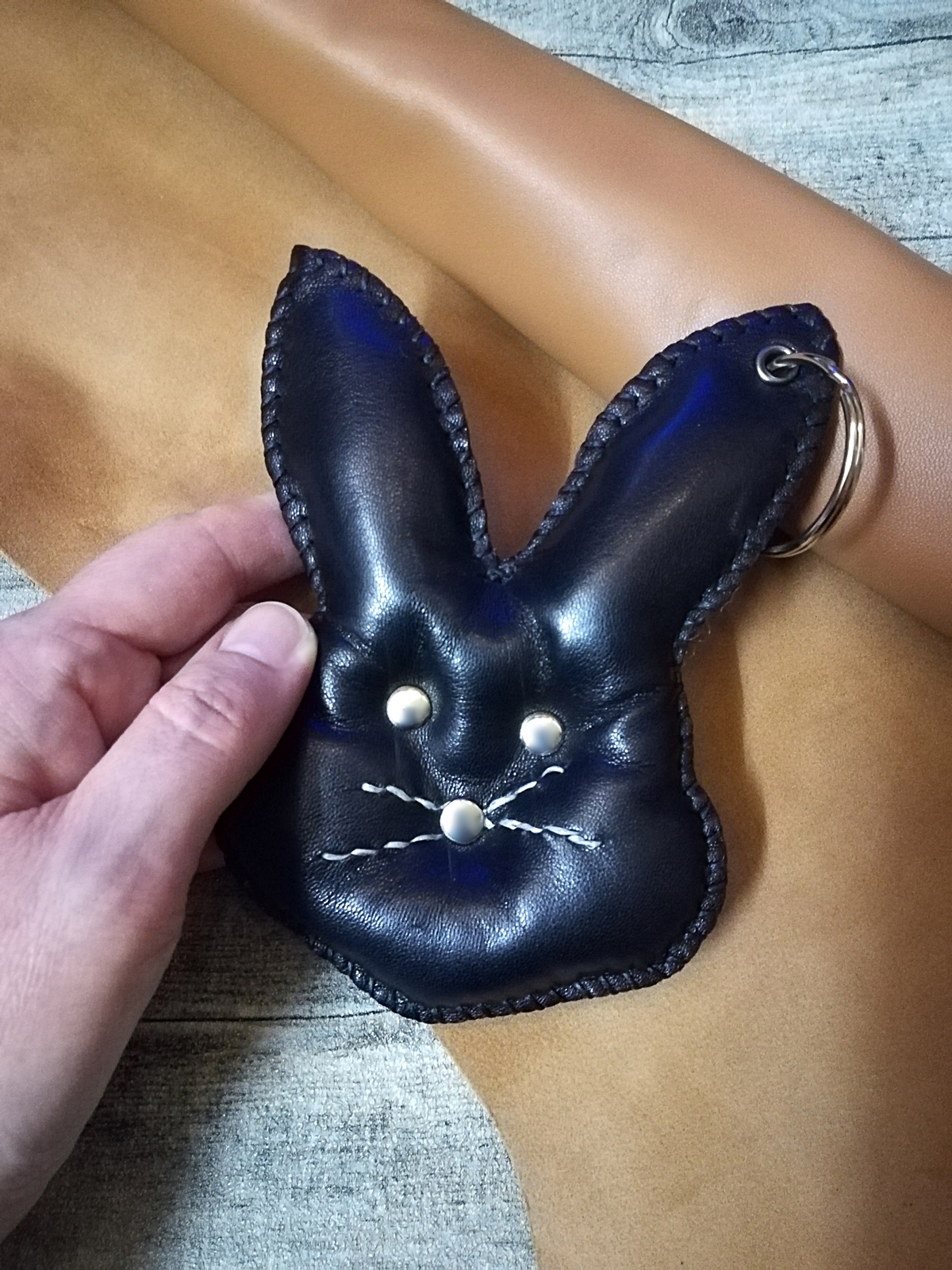 Der Schlüsselanhänger bzw. Taschenbaumler der Marke MONDSPINNE® besteht aus schwarzem, feinporigem Nappaleder. Er wurde aufwendig von Hand mit reißfestem Sattlergarn genäht. Er hat die Form eines stilisierten Hasenkopfes. Die Knopfaugen und das Näschen sind aus silberfarbenen Metallnieten. Die Schnurrhaare sind mit weißem Sattlergarn aufgestickt. Das Gesicht des Hasen ist übrigens auf beiden Seiten des Anhängers zu sehen… In einem Ohr ist eine Metallöse, an der ein extra großer Schlüsselring angebracht ist. Das Häschen ist weich gepolstert, so dass es plastisch wirkt und angenehm in der Hand liegt. Der Anhänger misst ca. 14,5 cm an der längsten Stelle und ungefähr 10 cm an der breitesten Stelle. Der XL-Anhänger liegt aufgrund seiner Größe sehr gut in der Hand.
