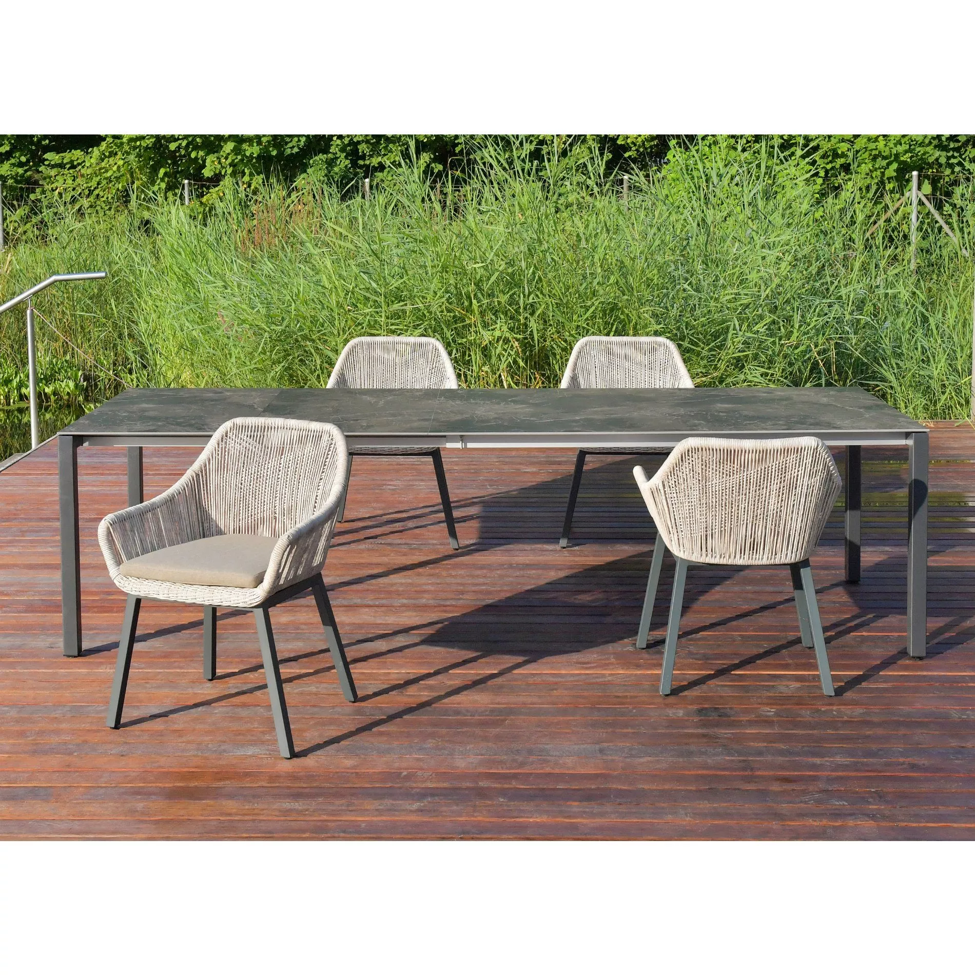 Sie suchen einen Tisch, der der stilvolle Mittelpunkt Ihrer Terrasse werden soll? Dann werfen Sie einen Blick auf den ausziehbaren Gartentisch “Manhattan” der Marke SIT Mobilia. Das variable Tischsystem “Manhattan” bietet die Möglichkeit, das moderne Aluminiumgestell mit einer Dekton-Tischplatte zu kombinieren. Die Verlängerung erfolgt über zwei Dekton-Einlagen à 60 cm an der Stirnseite des Tisches. Den exklusiven Outdoor-Tisch gibt es in den Größen 160/220/280×95 cm, 180/240/300×95 cm und 210/270/330×95 cm. Hier finden immer ein paar Gäste mehr einen stilvollen Platz zum Plaudern, Essen und Entspannen.