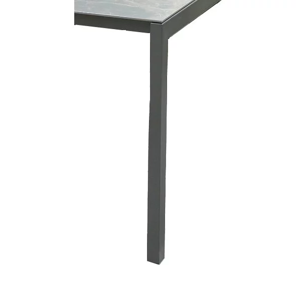 Das Gestell wird durch eine Tischplatte aus Dekton ergänzt. Dekton ist ein hochverdichtetes Material, das viele Vorteile vereint: Es ist kratzfest, temperaturbeständig und lichtecht. Aufgrund seiner nahezu porenfreien Beschaffenheit können Flüssigkeiten nicht eindringen, es ist fleckenfest und extrem strapazierfähig – ideal für Tischplatten und Arbeitsplatten. Dekton ist zudem pflegeleicht und langlebig.