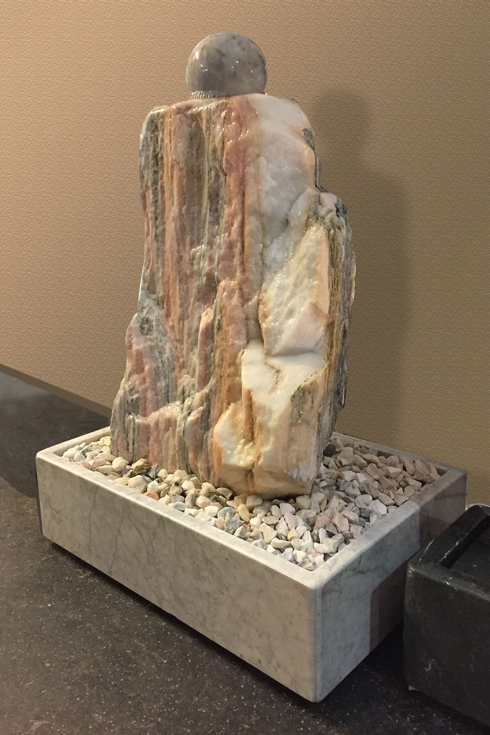 Dieser wunderschöne Marmor-Brunnen (dieser Kugelbrunnen ist ein absolutes Unikat. Sie erhalten exakt dieses Exemplar.), mit seinem harmonischen Design und der drehenden Marmorkugel (d: 15 cm), ist ein echter Blickfang. Der Quellstein ist aus einem Sölker-Marmor-Felsen gefertigt. Dieses Material aus dem Herzen der österreichischen Alpen begeistert durch sein schöne Zeichnung und Farbgebung. Die Kugel ist aus dem Material “Soliste” (Herkunft: Griechenland bzw. Bulgarien) gefertigt und dreht sich aufgrund der perfekten Ausführung ruhig und gleichmäßig auf dem Wasserfilm.