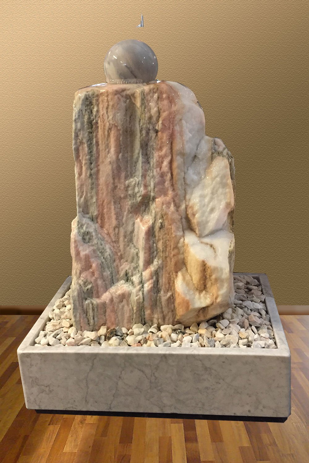 Der Brunnen steht auf einer robusten Hartschaum-Kontruktion, die nur mit wenig Sölkermarmor-Dekorkiesel abgedeckt ist. Der Basistisch ist von allen Seiten eingreifbar (“Eingriffsklappen”; siehe Abb. 4 & 5), so dass für die notwendigen Service- und Reinigungsarbeiten, der schwere Felsen niemals bewegt werden muß.