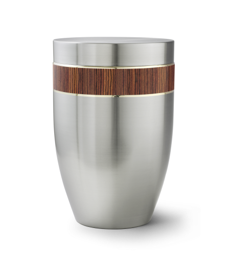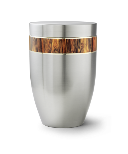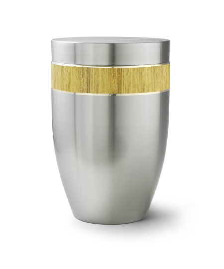 Die Urnen der Edition Melina besitzen eine gebürstete Oberfläche aus hochwertigem Stahl. Das umlaufende Zierband wird von zarten Goldstreifen eingefasst.