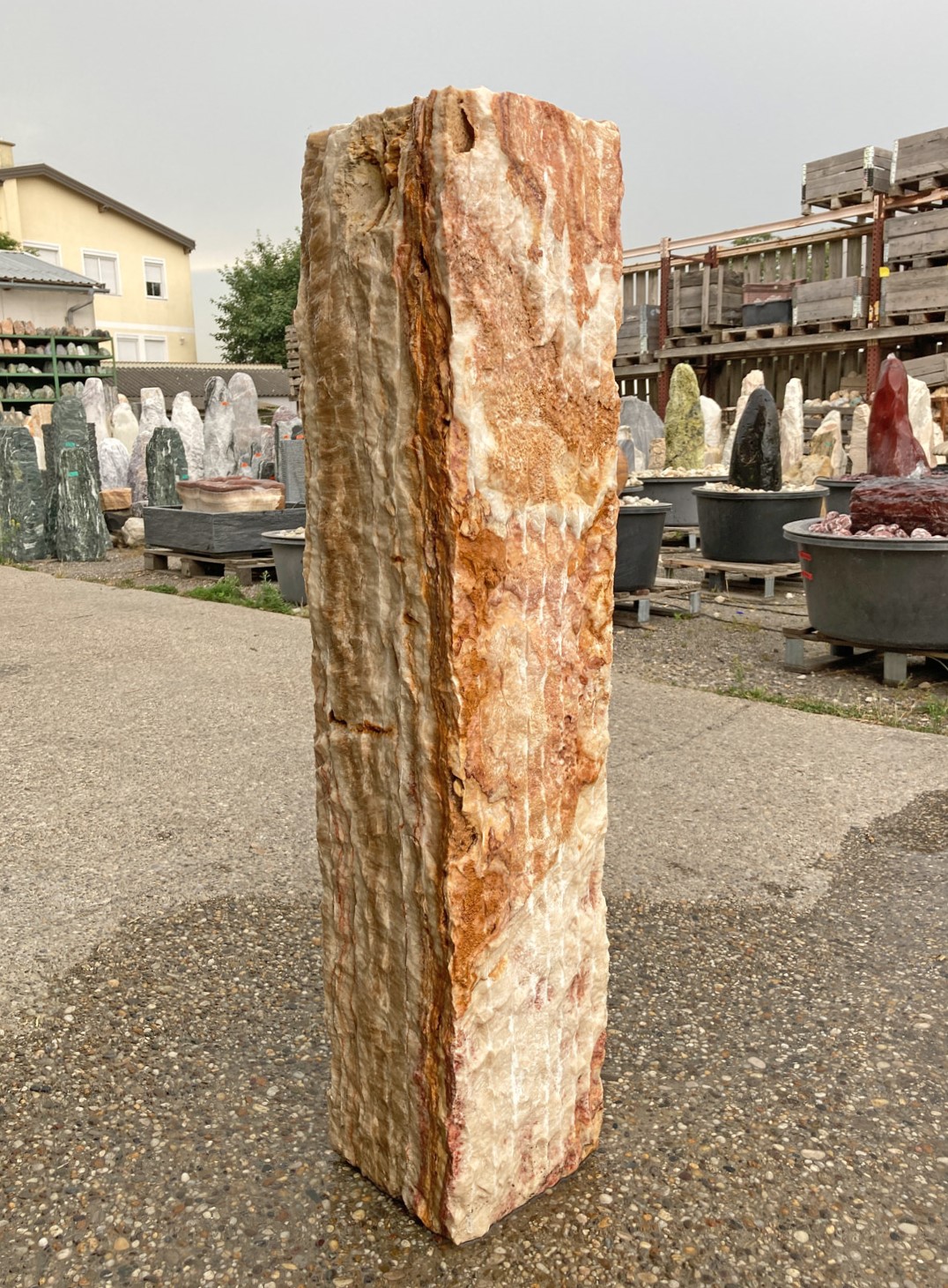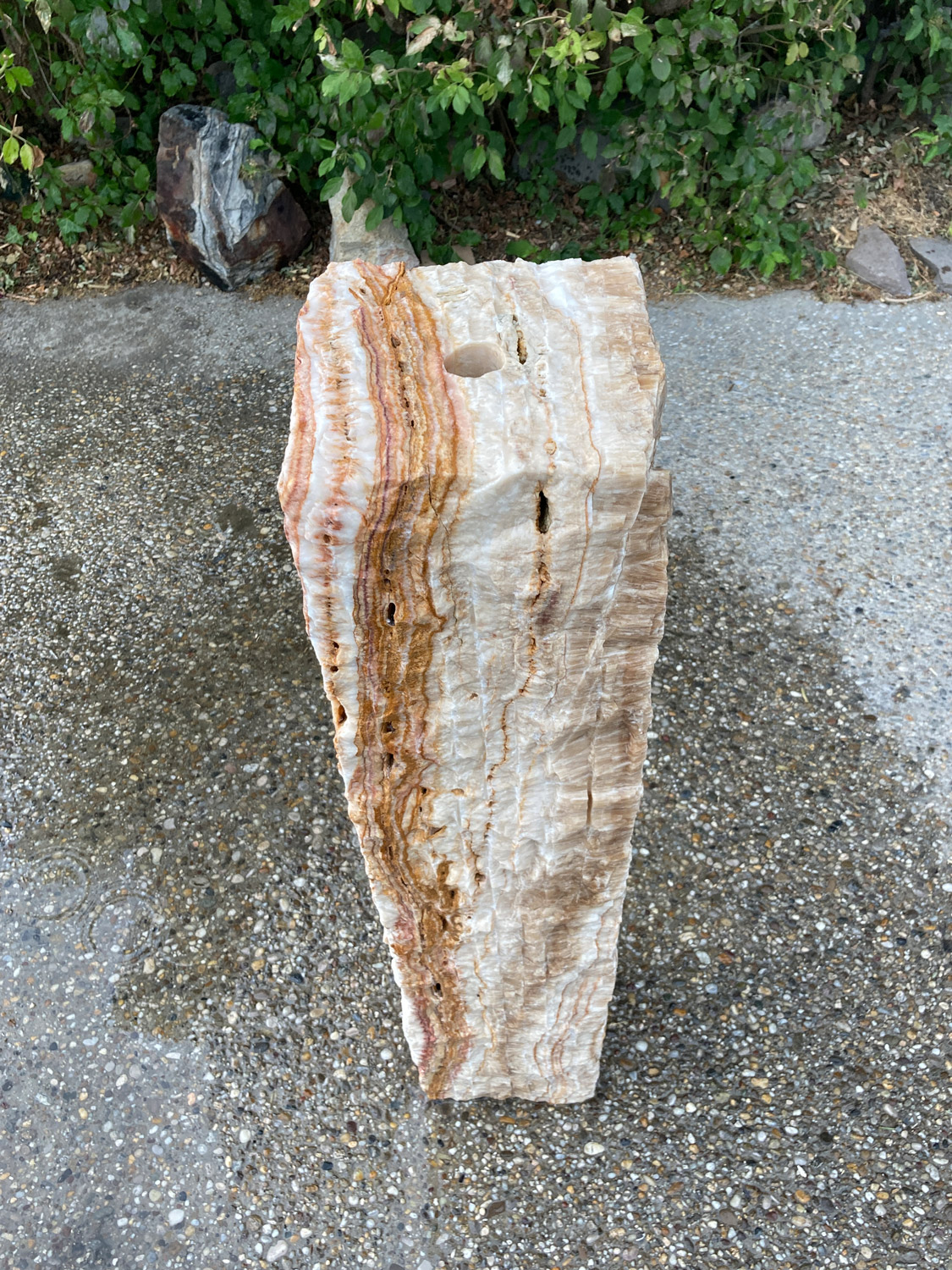 Dieser gestreifte Onyx (Herkunft: Ägäis Raum) besticht durch seine feine Zeichnung und durch sein wunderbares Farbenspiel. Dieser Stein wird ein herrlicher Blickfang in Ihrem Garten sein. Das Material ist 100% frostsicher!