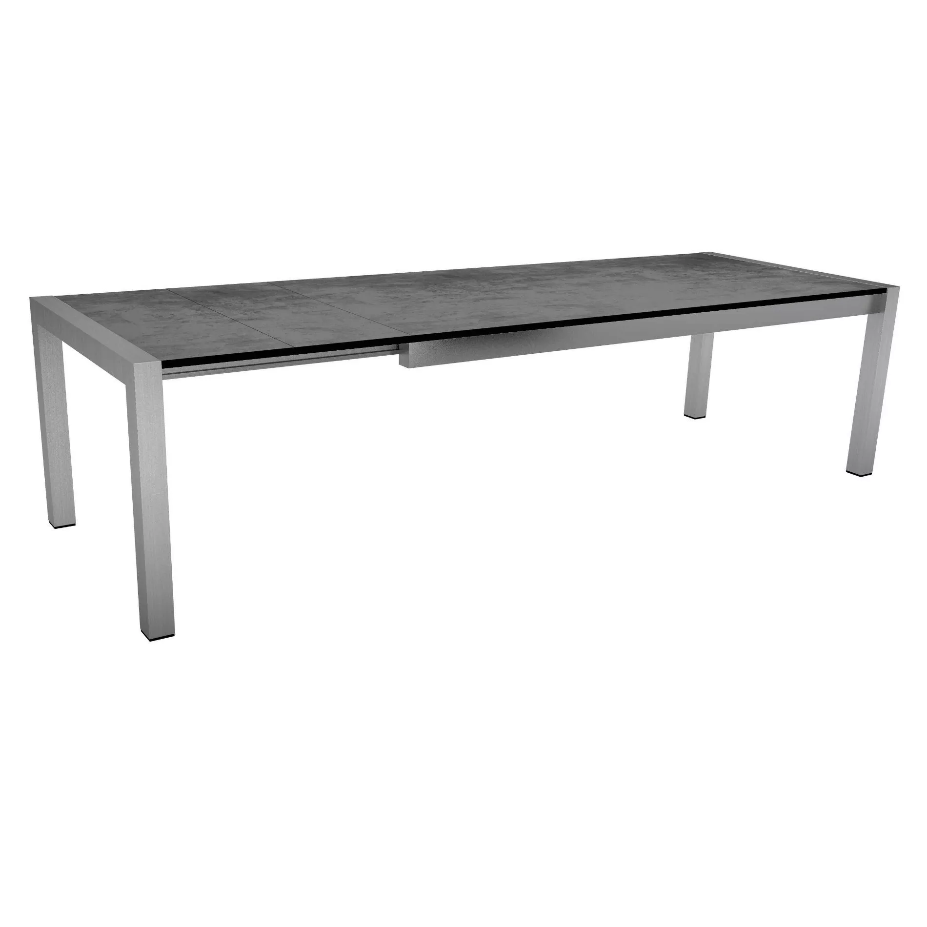 Das Gestell des Tisches ist aus Edelstahl. Für die Produktion der Stern Edelstahlmöbel wird ein rostfreier Edelstahl der Güteklasse 304 eingesetzt. Besser bekannt auch unter 18/10-Stahl. Diese Chrom(18%)- Nickel(10%)-Stahl-Legierung ist besonders widerstandsfähig gegen Korrosion und sorgt für eine lange Lebensdauer. Zwei der vier Tischbeine haben Verstellgleiter, sie gleichen leichte Unebenheiten des Bodens aus. An den anderen beiden Tischbeinen befinden sich kleine Rollen, um den Gartentisch leichter ausziehen zu können.