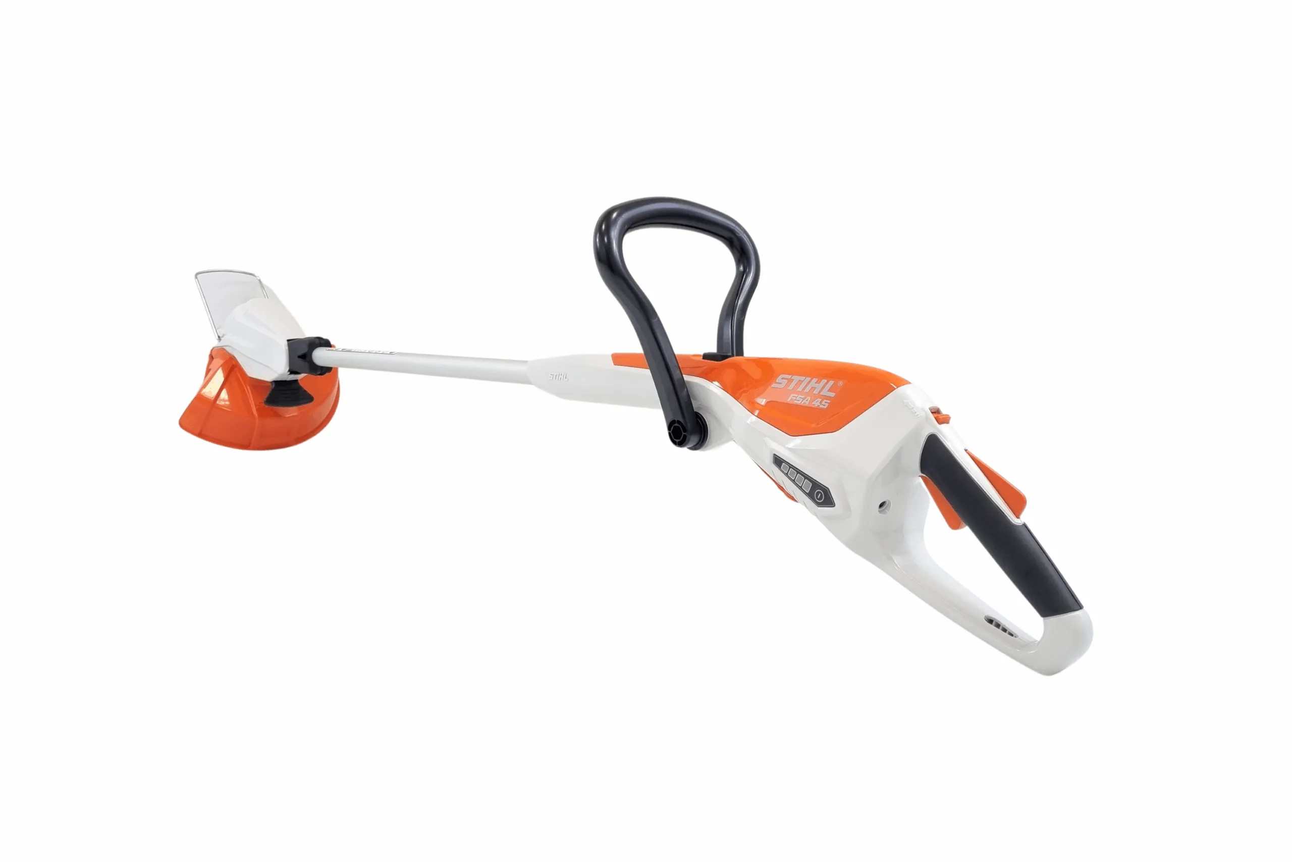 Mit einem Gewicht von nur 2,3 kg ist die akkubetriebene Motorsense STIHL FSA 45 besonders leicht und sehr komfortabel. Der Teleskop-Schaft und der Bügelgriff sind werkzeuglos einstellbar. So können Sie insbesondere Ihren Rücken bei der Arbeit schonen. Der Arbeitswinkel der Mäheinheit kann mühelos justiert werden, wenn Sie beispielsweise vertikal Kanten schneiden möchten. Dank des hoch- und herunterklappbaren Abstandsbügel können Sie sicherstellen, dass Sie rund um Bäume und Pflanzen sowie bei Gegenständen schonend und präzise trimmen können. Der Softgriff liegt gut in der Hand und ermöglicht es Ihnen durch den Schalthebel und die Schalthebelsperre, den Akku-Rasentrimmer stets zuverlässig und sicher zu steuern. Durch die Einhängeöse können Sie die Motorsense platzsparend aufbewahren.