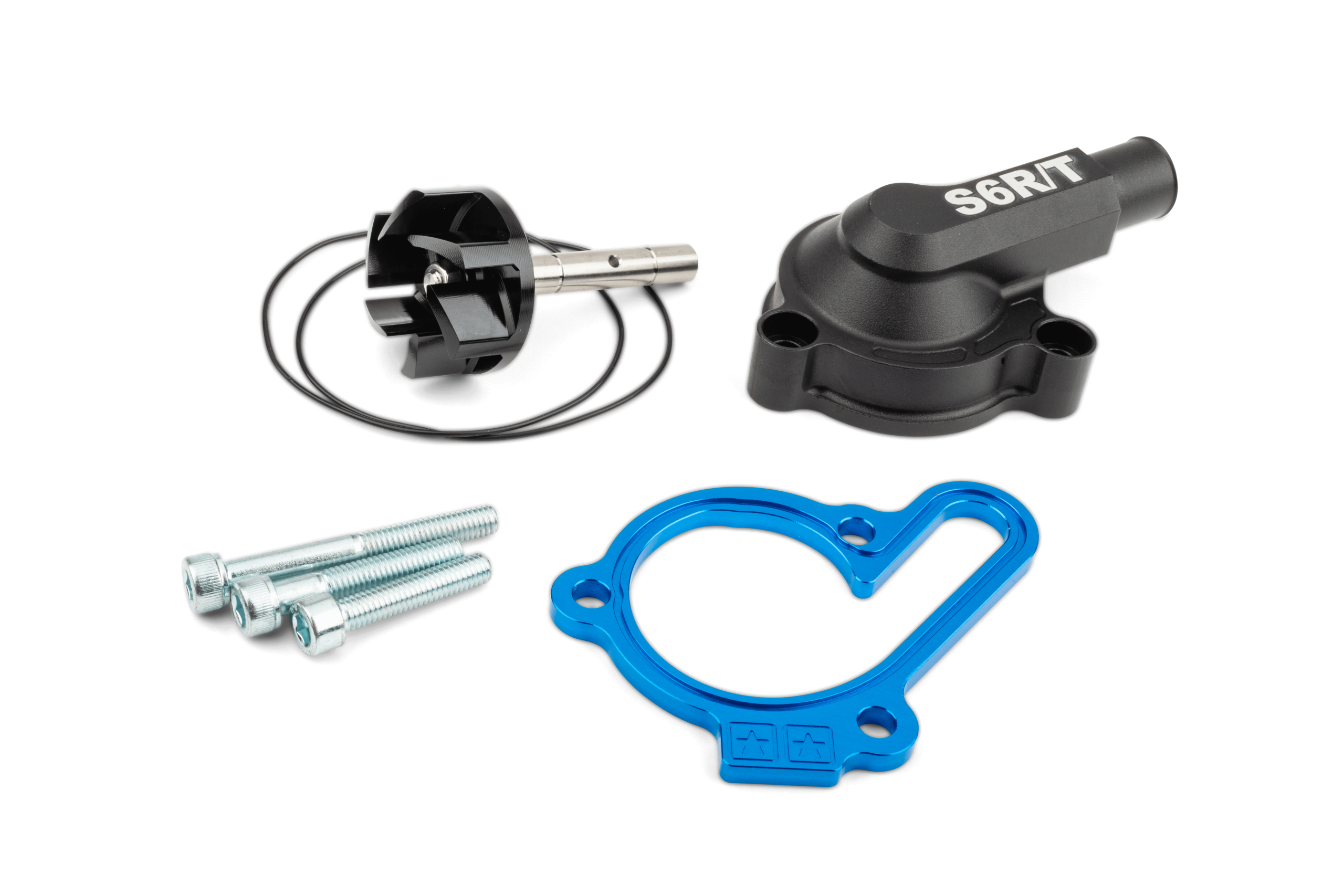 Das Wasserpumpenkit enthält einen farbig eloxierten Spacer für den Deckel, eine Antriebswelle, ein Oversize Wasserpumpenrad, einen CNC Wasserpumpendeckel, O-Ringe und Schrauben.