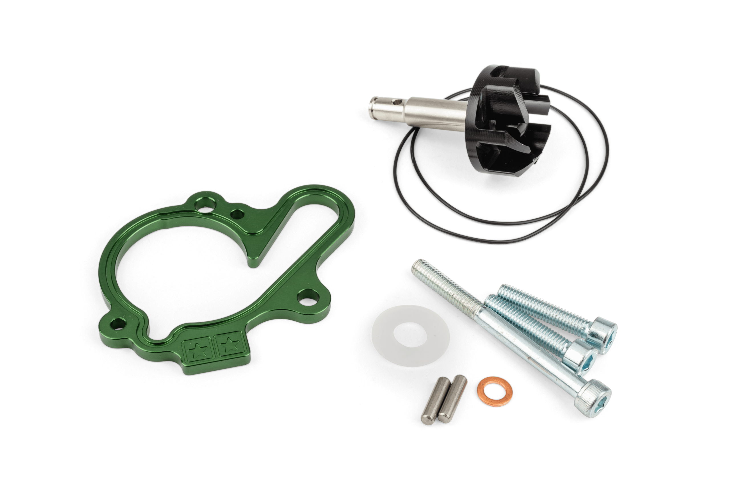 Das Wasserpumpenkit enthält einen farbig eloxierten Spacer für den Deckel, eine Antriebswelle, ein Oversize Wasserpumpenrad, O-Ringe und Schrauben.