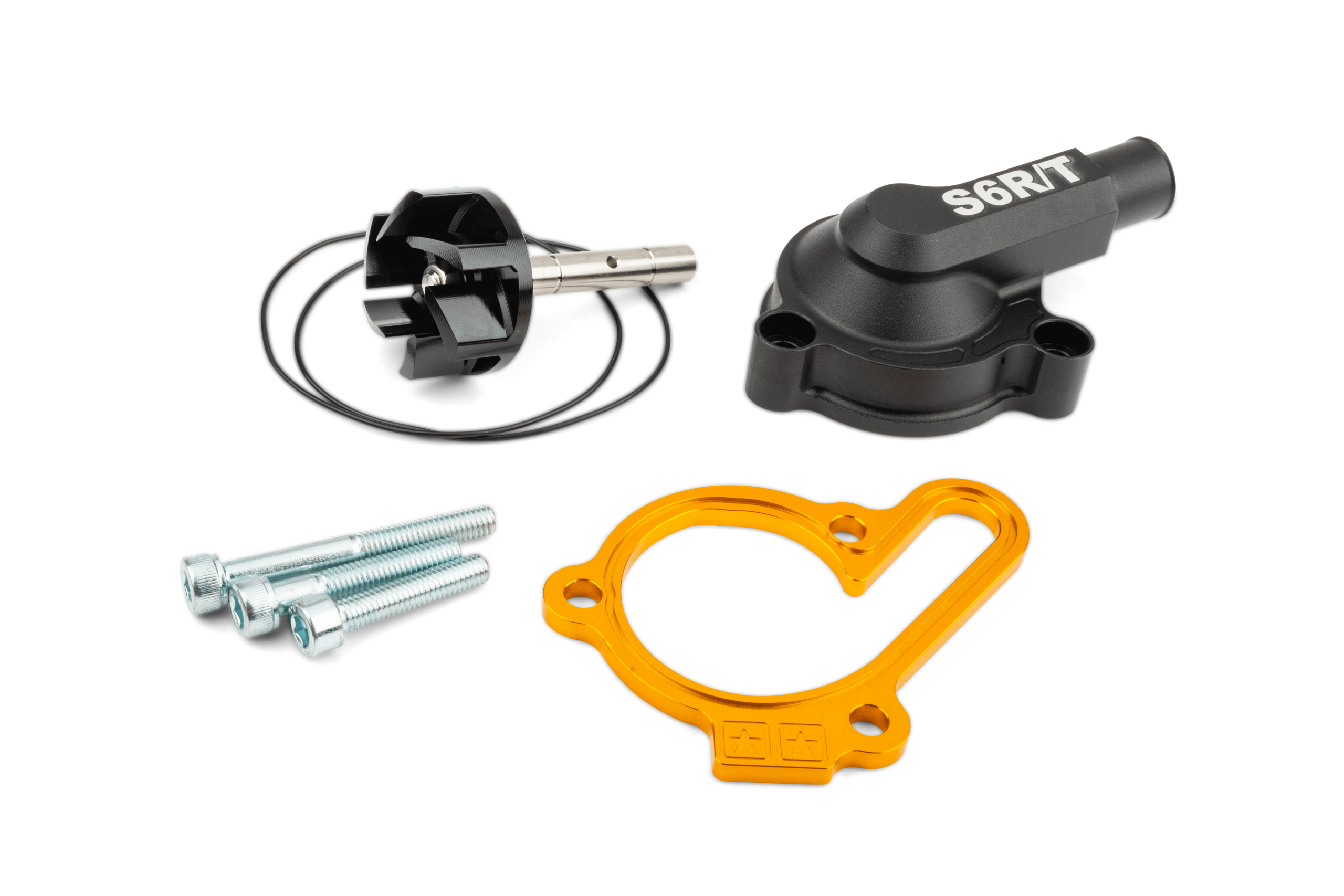 The water pump kit contains a colored anodized spacer for the cover, a drive shaft, an oversize impeller, a CNC water pump cover, O-rings and screws.