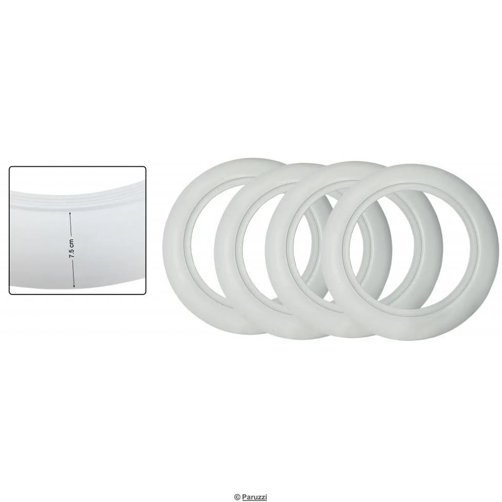 Es werden weiterhin Reifen mit weißem Rand produziert. Einige Marken bieten dies als sogenanntes klassisches Armband oder als modernes Armband mit weißer Oberfläche an. Das ist immer die beste Wahl, aber als preisgünstige Alternative bieten sich diese Reifenringe aus Gummi an, die zwischen die Felge geklemmt werden. Dadurch wird das gleiche Erscheinungsbild erreicht, sie haben aber auch eine Reihe von Nachteilen: Durch die Reibung kann sich der Reifenring in die Seitenfläche fressen, sie halten hohen Geschwindigkeiten nicht stand und verfärben sich mit der Zeit, die Verfärbung ist kaum zu stoppen. .