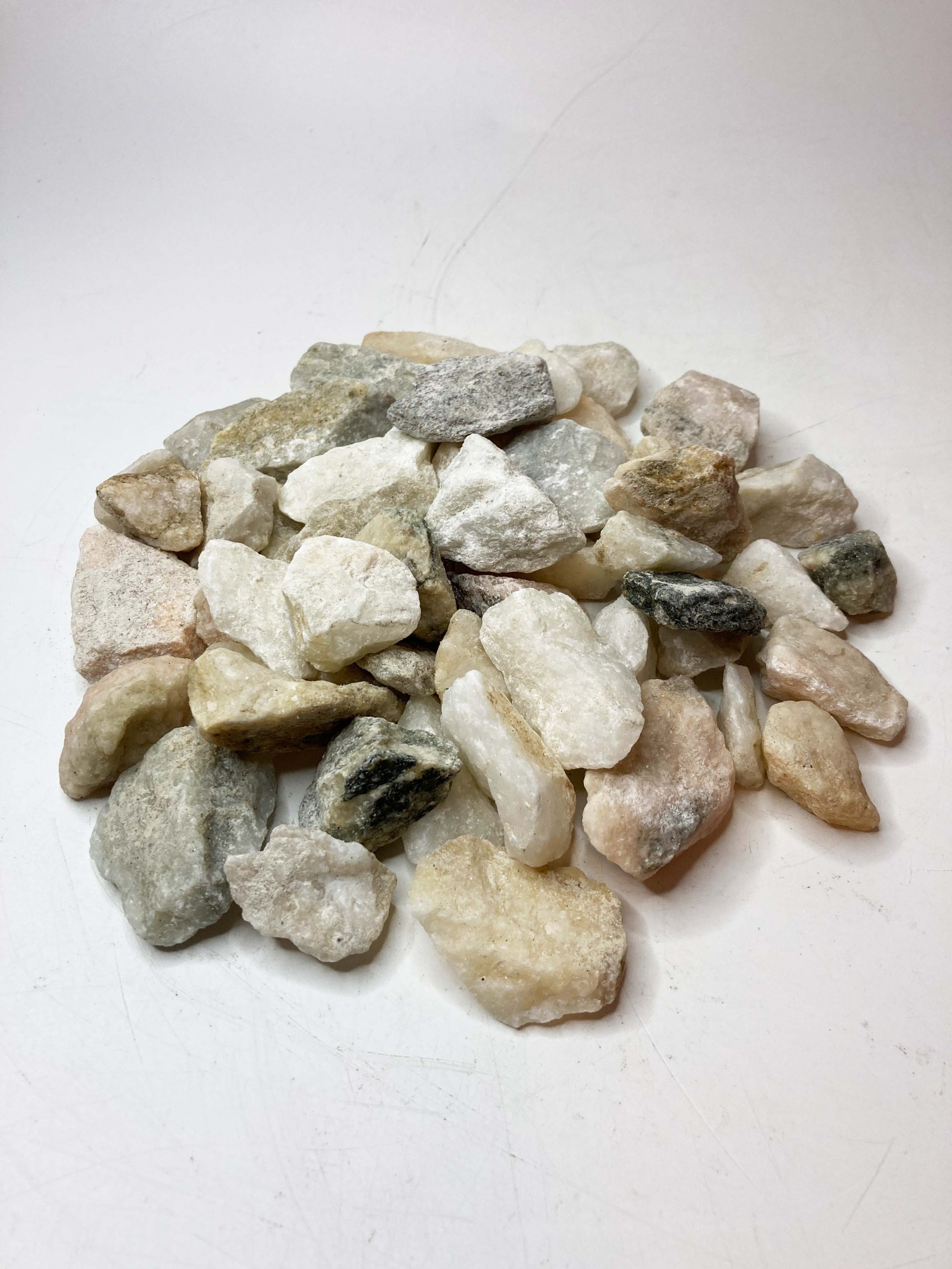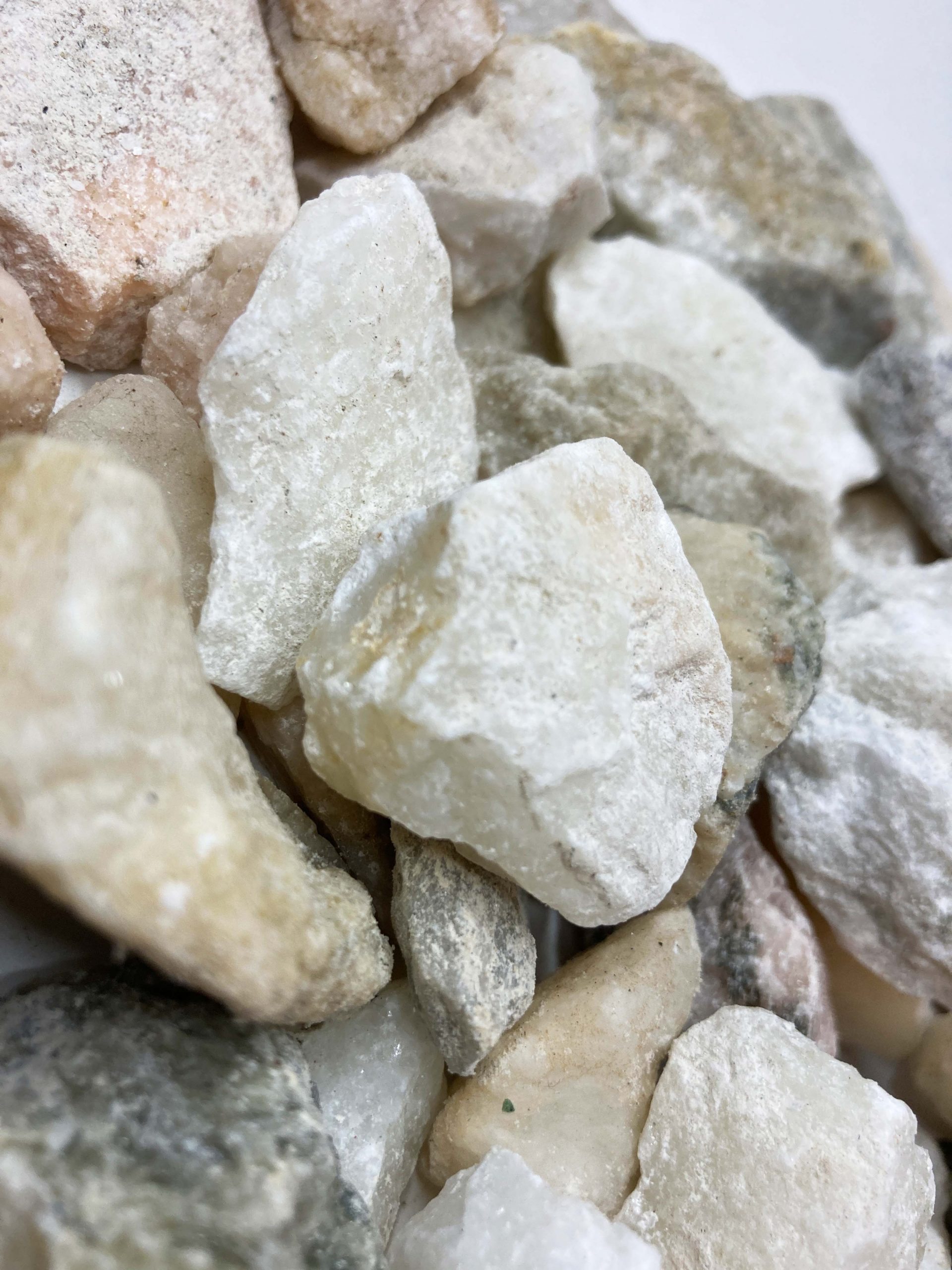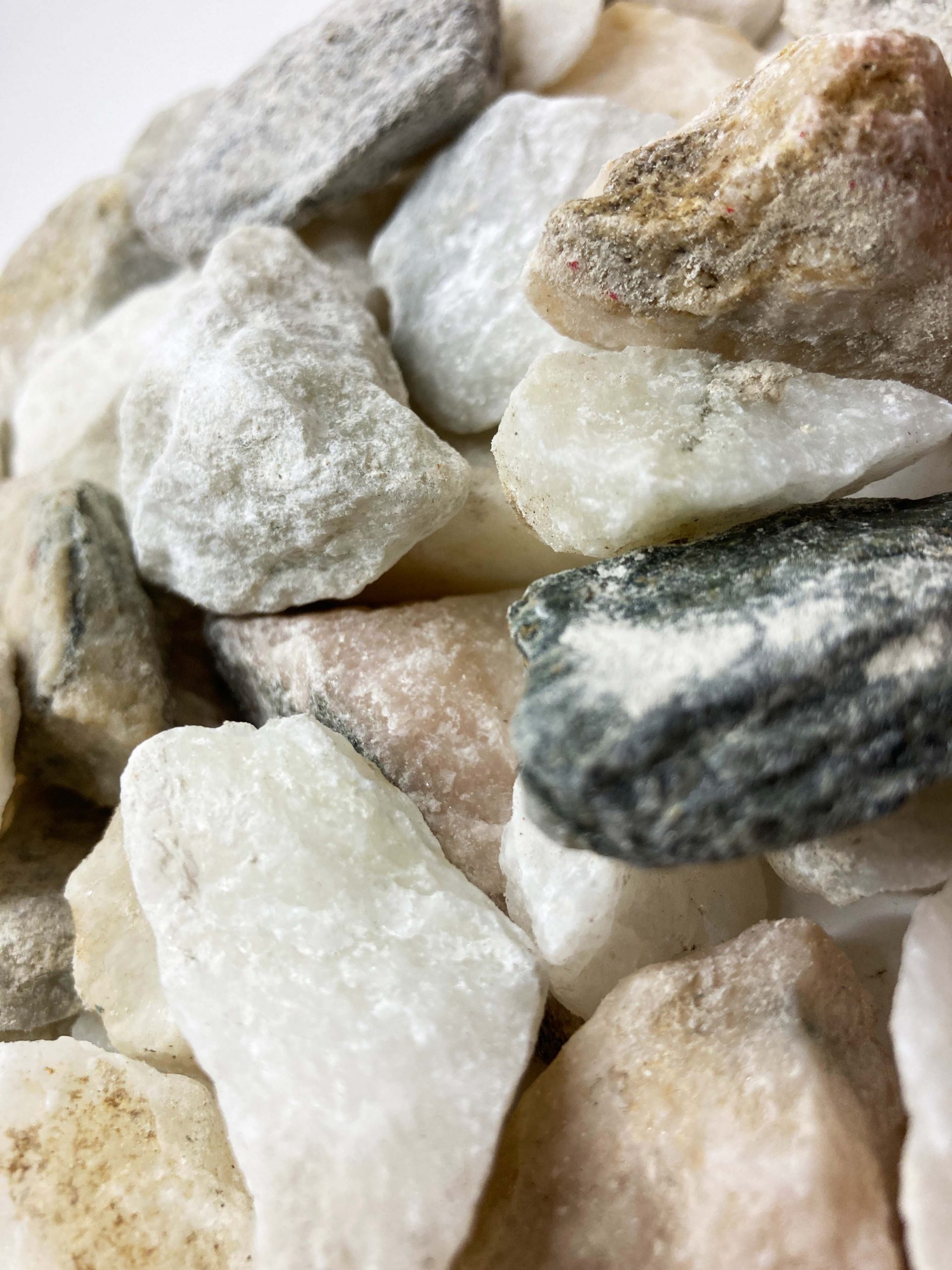 Gebrochener, natur-bunter Marmorkiesel mit Farbanteilen von weiß, rosa & grau-grün!